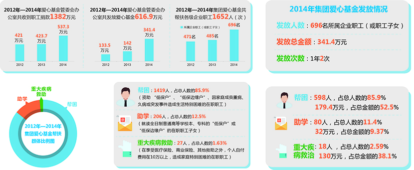 在逐年扩大爱心基金覆盖范围,加大帮扶力度的同时,集团也根据实际情况,先后两次对爱心基金管理的制度和程序进行了细化和完善,以 更好地规范资金的管理与使用,更好的服务和满足职工需求。目前集团爱心基金每年申报和发放两次,主要用于帮困、助学和重大疾病救助。爱心基金的申报和发 放,均在集团和所属企业范围内进行公示,主动接受职工群众监督。